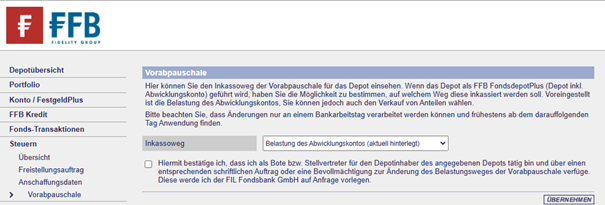 Berater können die Umstellung im jeweiligen Depot unter Steuern > Vorabpauschale vornehmen. Dazu müssen sie schriftlich von den Kunden beauftragt sein. Alternativ können Kunden den Inkassoweg im FFB Frontend unter dem gleichen Menüpunkt selbstständig ändern.