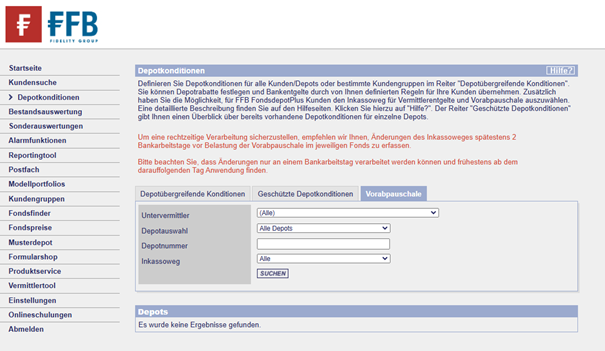 Aus Effizienzgründen können Berater die Umstellung auch für mehrere Depots gleichzeitig vornehmen. Das gelingt in der Vermittleransicht unter dem Menü-Punkt Depotkonditionen > Vorabpauschale. Hier können per Suchfunktion gezielt Depots ausgewählt und der Inkassoweg angepasst werden.