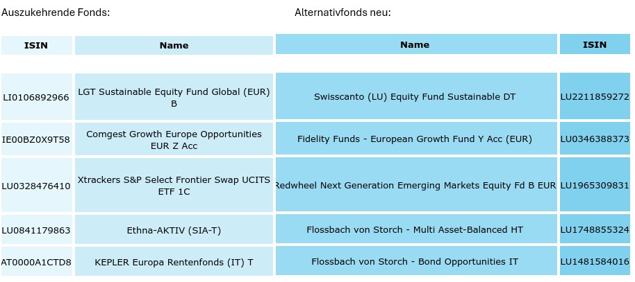 Im Folgenden sind die zu tauschenden Fonds mit ihrer jeweiligen Begründung und dem ausgewählten Ersatzfonds aufgelistet. In hellblau gesetzt sehen Sie die auszukehrenden Fonds genannt, in dunklerem blau gehalten sind die neuen Fonds.